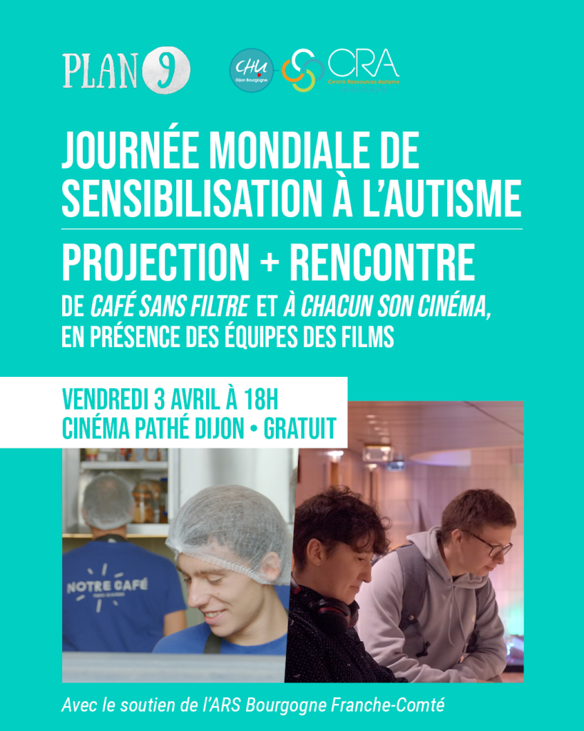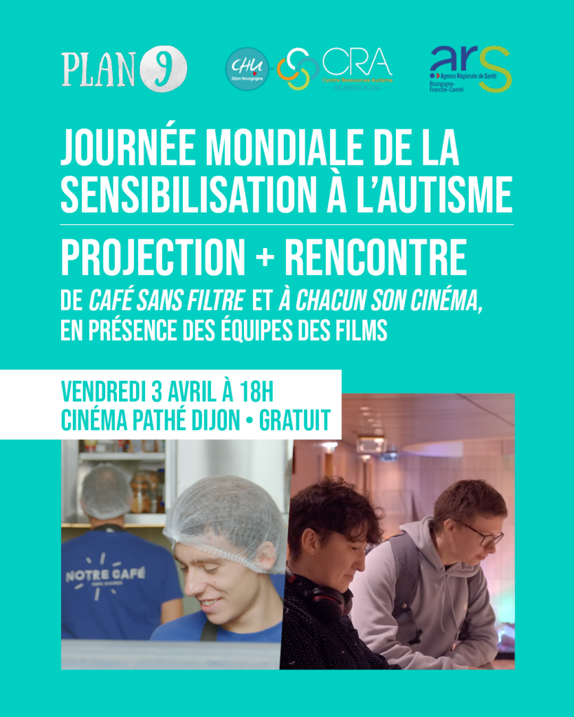 À l'occasion de la Journée mondiale de la sensibilisation à l'autisme, l'association Plan9 et Le Centre Ressources Autisme (CRA) de Bourgogne vous propose une projection des films "Café sans filtre" (69 min) et "À chacun son cinéma" (10 min), suivie d'une rencontre avec les équipes du film.Réserver votre place :…